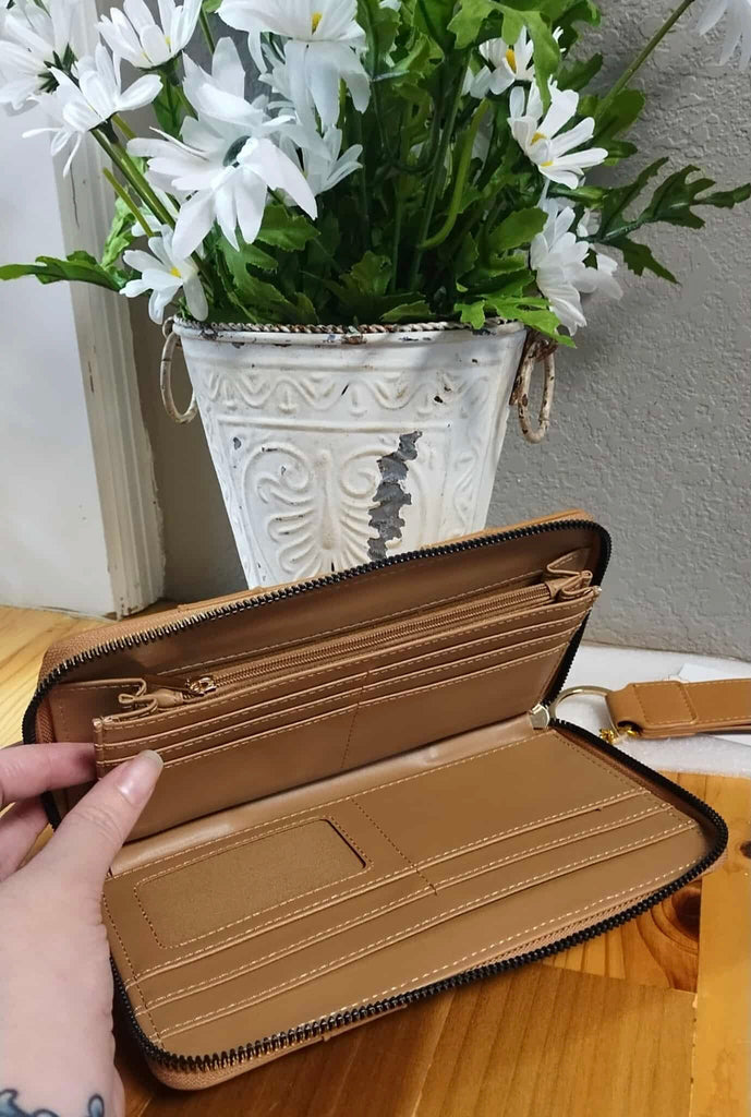 Show off your Southern charm with the Simply Southern Large Zip Wallet, featuring a stylish gold logo and a braided faux leather trim for a fun, stylish touch. Perfect for keeping all your essentials organized with a splash of personality!