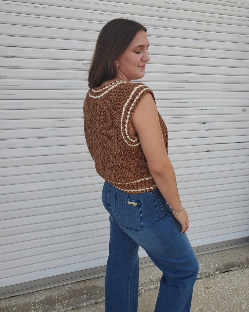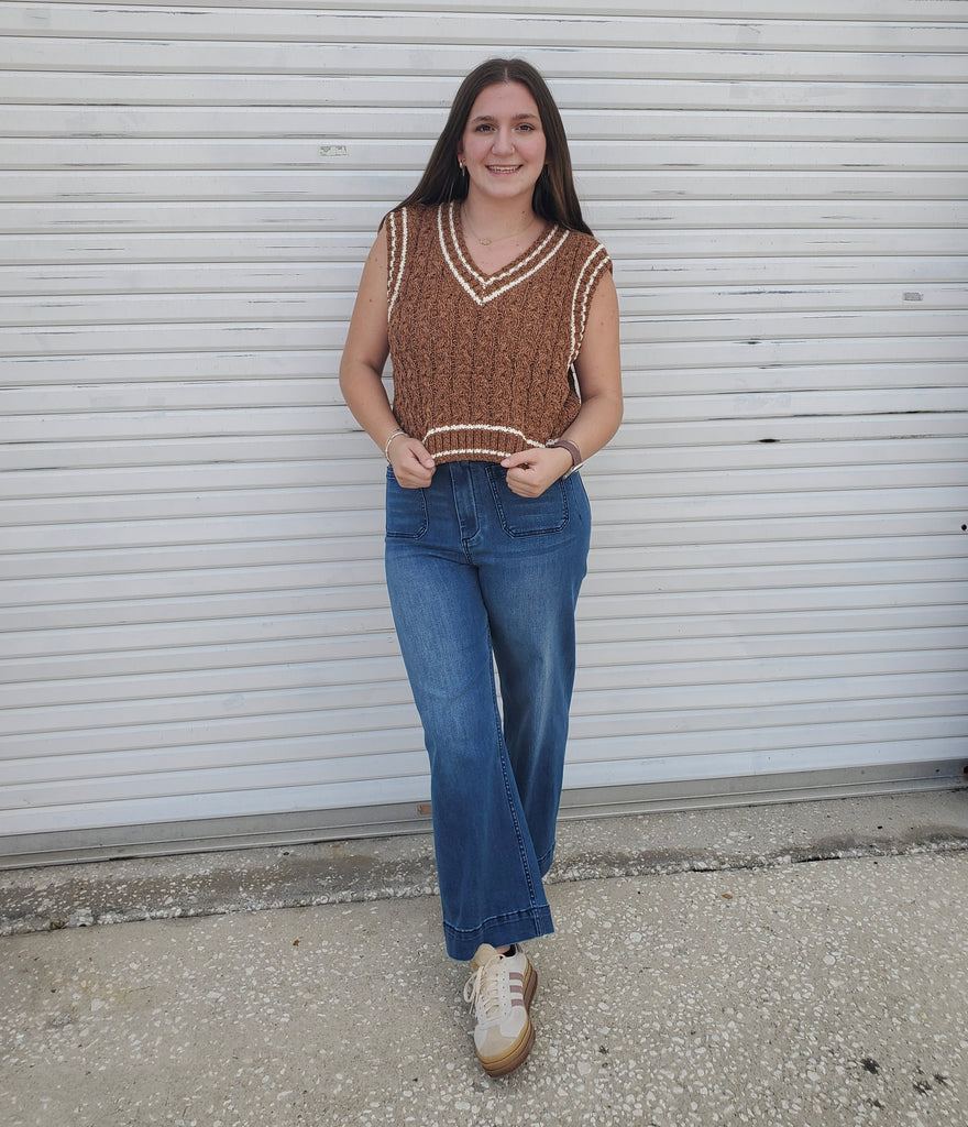 The Cinnamon Sprig Vestie from Simply Southern is a soft, loose, cable-knit pullover sweater vest that's as cozy as it is cute. Trimmed in cream for a charming contrast, this playful piece adds warmth and style to any outfit with effortless Southern flair.