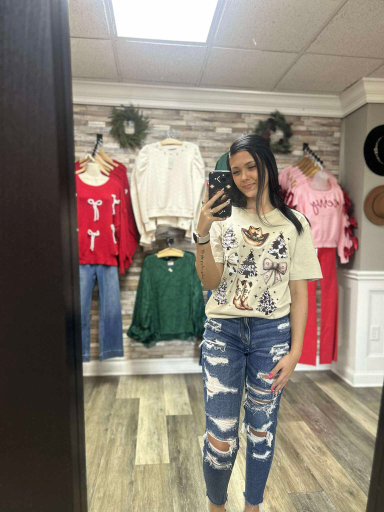 Saddle up for the holidays in this playful country Christmas graphic tee! Featuring a charming collection of cow print trees, a classic cowboy hat, boots, and western printed bows, this tee brings festive cheer with a fun twist. Perfect for anyone who loves mixing holiday spirit with their love of all things western. Cozy, quirky, and ready to turn heads at your next seasonal gathering.