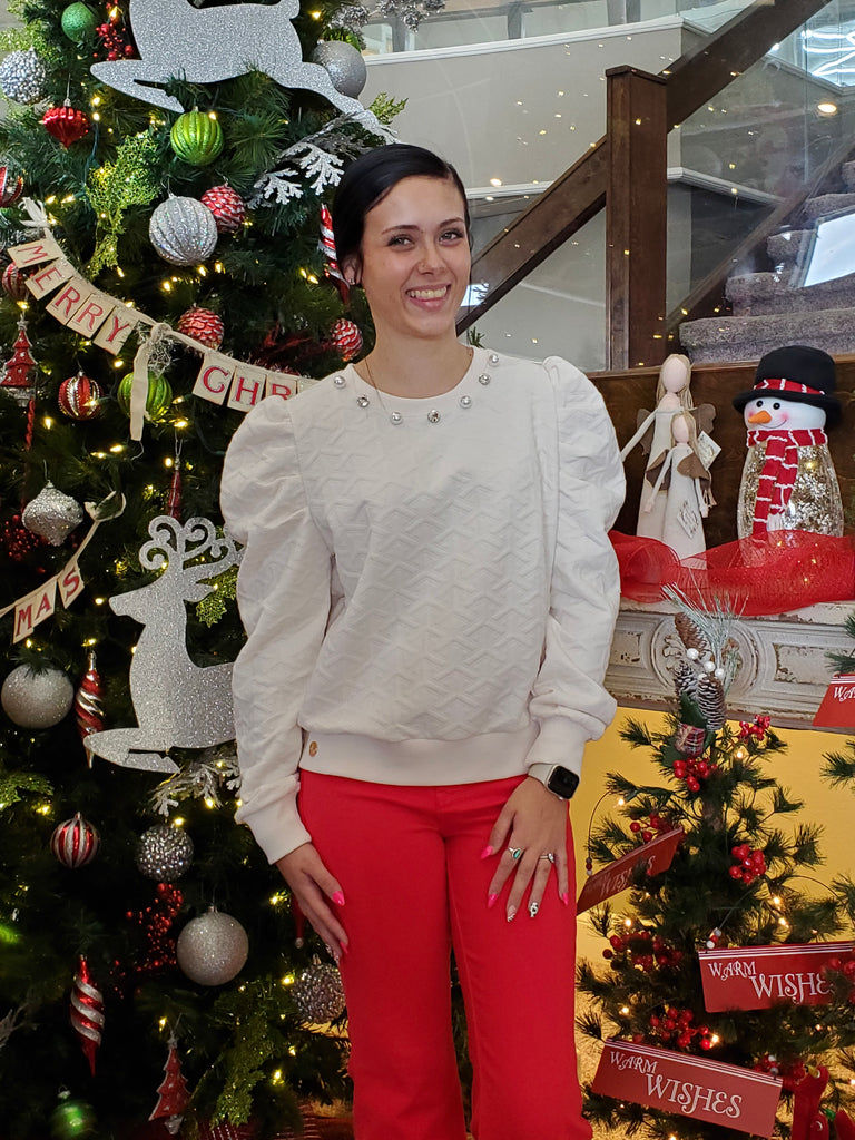 Introducing our Vanessa Vanilla Quilted Pullover - combining comfort and style with a playful twist! The puffy shoulders add a unique touch, while the pearls and rhinestones around the neckline bring a touch of elegance. Stay warm and chic with this must-have long-sleeve pullover.