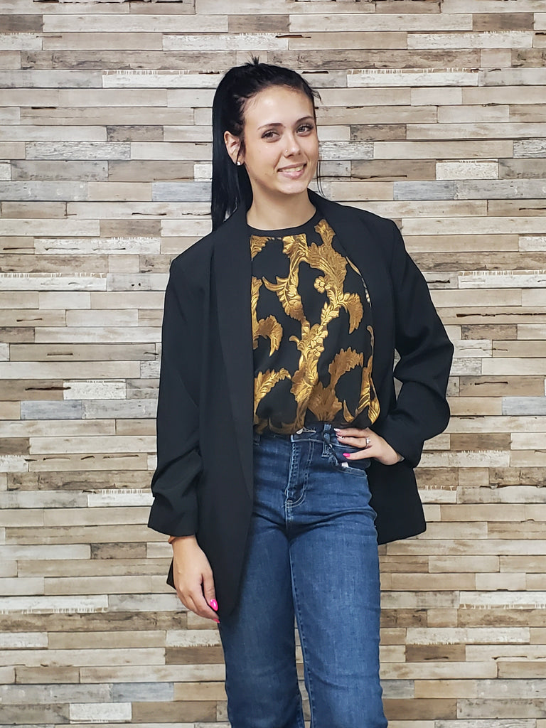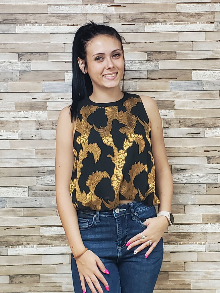 Elevate your evening look with the Phoenix Tank, a show-stopping piece that blends sophistication with a touch of whimsy. This dressy blank tank features shimmering gold feather designs that catch the light beautifully. The high neckline offers elegant coverage, while the back zipper adds an unexpected edge and easy on-and-off convenience. A hidden elastic waist ensures a flattering, comfortable fit all night long. Perfect for cocktail parties, date nights, or whenever you want to feel fabulous.