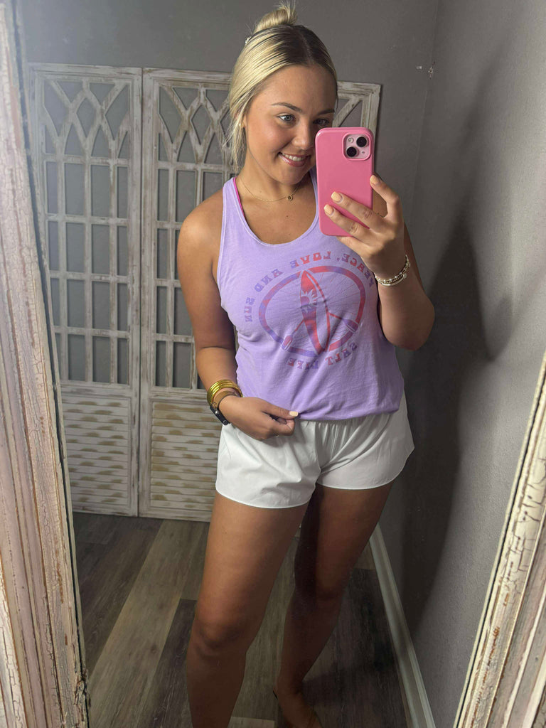 Embrace sunny days with this lilac racerback tank featuring a playful tie-dyed graphic and a scalloped hem for a flirty finish. Perfect for paddleboarding or just soaking up the sun, it combines comfort and style effortlessly. Let your carefree spirit shine with every wear!