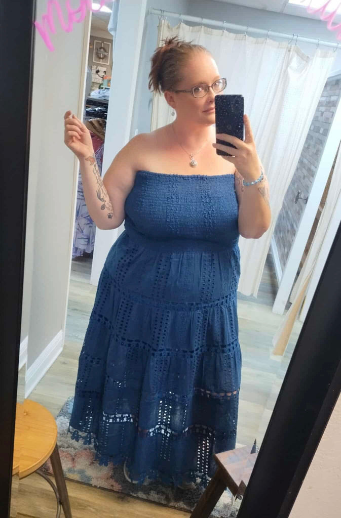 Effortless elegance meets timeless style with this navy tube top midi dress. The fitted smocked bodice creates a flattering silhouette, while the eyelet and crochet skirt adds romantic texture and movement. Lined to the knees for comfort and coverage, this versatile piece transitions seamlessly from day to evening. Perfect for warm-weather occasions, garden parties, or casual outings where you want to look polished without trying too hard.